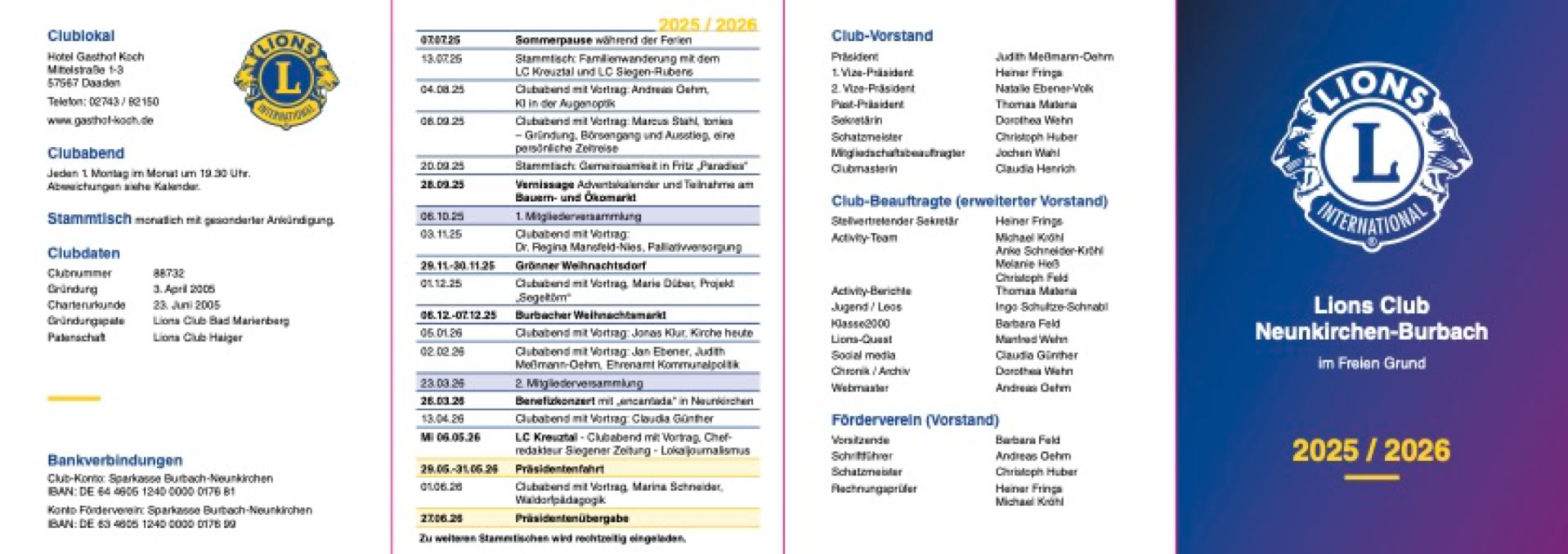 Jedes Jahr im „Lions Club Neunkirchen-Burbach im Freien Grund“ ist geprägt von den Intentionen des/der jeweiligen Präsidenten/in. Sein/Ihr Jahr wird individuell geplant und vom Präsidenten/in durchgeführt und moderiert. Das aktuelle Jahresprogramm unserer amtierenden Präsidentin, Judith Meßmann-Oehm, finden Sie unten.